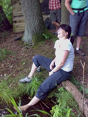 Die Tour sollte aber auch sonst nicht ohne Blessuren verlaufen. Claudia vertrat sich, knickte um und bekam einen dicken Knöchel, der erstmal im Wasser gekühlt werden musste und auch Leila ertrug ihre Blasen an den Füßen still und tapfer. So hatten es die Bruchpiloten auch verdient sich auf der Inselgaststätte mit Speis und Trank zu stärken. Während der Pause war jedoch noch Gelegenheit den auf der Insel versteckten Schatz (ein Geo-Cache) zu suchen. Franz, Angela und Jörn zogen los, ausgestattet mit dem GPS-Gerät von Ulf, unserem Ober-Cacher. Gesucht wurde unter jedem Stein und jedem Ast im Zielareal, aber gefunden haben wir den Cache leider nicht. Ein frustrierendes Erlebnis. Aber so ist es eben bei Anfängern, wenn der Meister nicht dabei ist. Geo-Caching bleibt aber ein bestimmt interessantes Hobby. Vielleicht versuchen wir es im Spätsommer noch einmal.