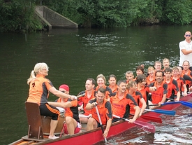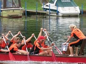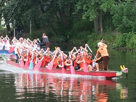 In diesem Jahr waren wir nach der „Abi-Pause“ 2013 wieder dabei beim Oranienburger Drachenbootfest. Mit den bekannten Paddlerinnen und Paddlern, aber erfreulicherweise auch wieder mit einigen Bruchpilotendebütanten. Das Meldeergebnis mit über 30 Mannschaften machte uns schon früh neugierig auf die Rennen und belegt erneut die Beliebtheit dieses immer wieder toll organisierten Drachenbootevents. Die Vorfreude bzw. Vorspannung wurde dabei schon in den ersten Trainingseinheiten weiter gesteigert. Das Bootsfeeling war wieder da, das Boot lief ganz gut. Aber wo würden wir uns einordnen können. Gorden als Steuermann im Training scheuchte uns ordentlich und ließ keine Gelegenheit ungenutzt, die Stärke des Teilnehmerfeldes zu betonen.