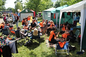 Am Samstag war es dann also endlich soweit. Erste Disziplin des Tages war der Wettlauf um die besten Plätze auf dem Regattaplatz. Das lief schon mal ganz gut, um kurz nach 6:00 Uhr haben wir noch ein schönes Plätzchen ergattert. Danke an Jan für die Unterstützung, eine halbe Stunde später hätten wir schon schlecht ausgesehen. Die Mannschaften rüsten mit dem Mannschaftslager aber auch immer weiter auf. Was da von den anderen Mannschaften antransportiert wird, gleicht schon einem kleinen Umzug. Da nehmen wir uns mit den Klapppavillons und den Campingstühlen bescheiden aus. Kühlschränke, Großgrills, Riesenpavillons, Bierzeltgarnituren und Boxen, mit denen man ein Konzert beschallen kann, alles war vertreten. Aber ich will nicht klagen, schließlich macht all das die Atmosphäre im Mannschaftslager aus.