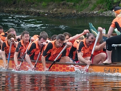Nach einem Jahr Pause nahmen wir wieder an unserer Traditionsveranstaltung, dem Oranienbruger Drachenbootfest teil. Ich war gespannt, wie wir uns im Duell mit den anderen Booten würden halten können. Schließlich zeigen die Geburtsdaten unserer Ausweise ziemlich weit in das letzte Jahrhundert. Die Mannschaftsaufstellung gestaltete sich dann auch schwieriger, als zunächst gedacht. Wieder fehlten erfahrene Paddlerinnen und Paddler wegen Abiturfeierlichkeiten ihrer Kinder, aber desto näher der Regattatag rückte meldeten sich weitere Bruchpiloten wegen Krankheit oder Zeitknappheit ab. Die Trainingstage zeigten zudem, dass nach zwei Jahren die „Drachenbootmuskeln“ etwas eingerostet waren und so mancherlei Schulter- und Rückenschmerz beklagt wurde.