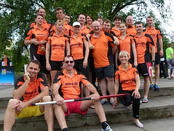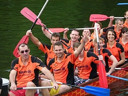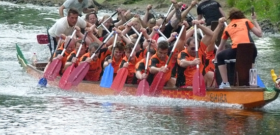 22 Mixed-Mannschaften gingen an den Start und wir duellierten uns im ersten Lauf gegen das Team All-In-One. Der Start war vorbildlich wie im Training und wir konnten uns rasch in Front schieben. Der Übergang zum Streckenschlag gelang ebenfalls hervorragend und mit einem ungefährdeten Sieg schossen wir über die Ziellinie. Doch was würde die Zeittafel anzeigen? 1:15:84 Min. - bisherige Laufbestzeit, aber starke Boote folgten noch. Tatsächlich sollte unsere Zeit durch die Crew des Boooooooooooooooooootes noch getoppt werden. Das war eigentlich keine große Überraschung, denn diese Mannschaft war auch in den vergangenen Jahren immer vorne mit dabei. Die nächste Orientierungsmarke sollte das Rennen der Samuras sein, ebenfalls ein Team, das in den vergangenen Jahren stets Siege oder Podiumsplatzierungen errungen hat. Die Zeit 1:20:36 Min., deutlich langsamer. Wow, heute geht was! Wir habens nicht verlernt. An dieser Stelle kurz liebe Grüße an Brita von unseren sympathischen Platznachbarn, die regelmäßig unsere Berichte liest. Kommentare bitte im Gästebuch. :-))
