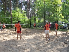 Am Nachmittag stand noch eine Einheit Beach-Volleyball auf dem Programm und 15 Bruchpiloten zogen los zu dem gut angelegten Spielfeld auf dem Campingplatz. Unbeschränkt von der sonst üblichen Spielhöhe in der Turnhalle mobilisierten die Spielerinnen und Spieler neue Kräfte und es entwickelten sich hart umkämpfte Partien dreier Mannschaften jeder gegen jeden. Aufgeheizt durch das intesive Spiel und natürlich auch sonst hart im Nehmen, ließen es sich Petra, Iris, Sabine und Jens nicht nehmen, im 13° C kalten Unterssee anzubaden. Respekt! Der Abend klang auf die schon gewohnte gemütliche Art aus und insbesondere Jan und Frank erwiesen sich als gute Witzeerzähler.